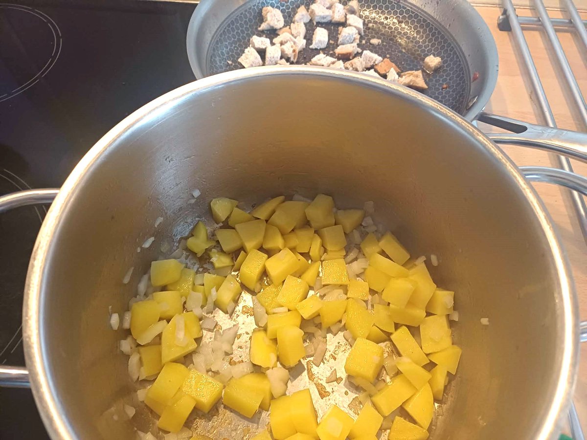 Das Öl in einem Topf erhitzen, Zwiebel- und Kartoffelwürfel darin anbraten.