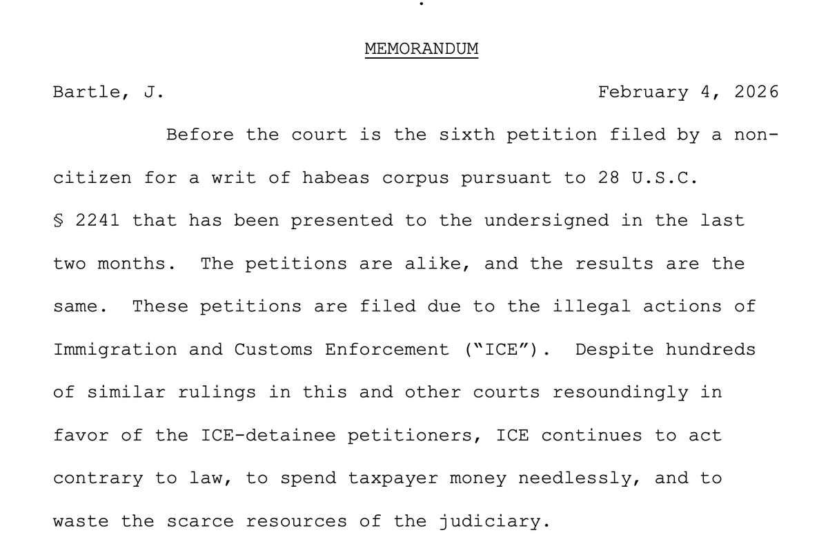 In another release order, Judge BARTLE — a George W. Bush appointee in Pennsylvania — vented today that ICE "continues to act contrary to law, to spend taxpayer money needlessly, and to waste the scarce resources of the judiciary." storage.courtlistener.com/recap/gov.usco…