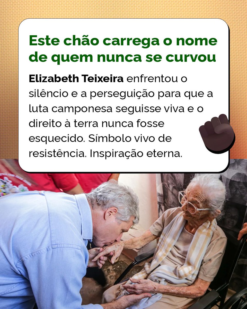 Para entender a importância deste dia, é preciso olhar para trás. Elizabeth Teixeira é símbolo das Ligas Camponesas e da resistência no campo. Em Sapé, onde o sangue e o suor marcaram a luta pela terra, hoje o que brota é a esperança de quem finalmente pode chamar o chão de seu.