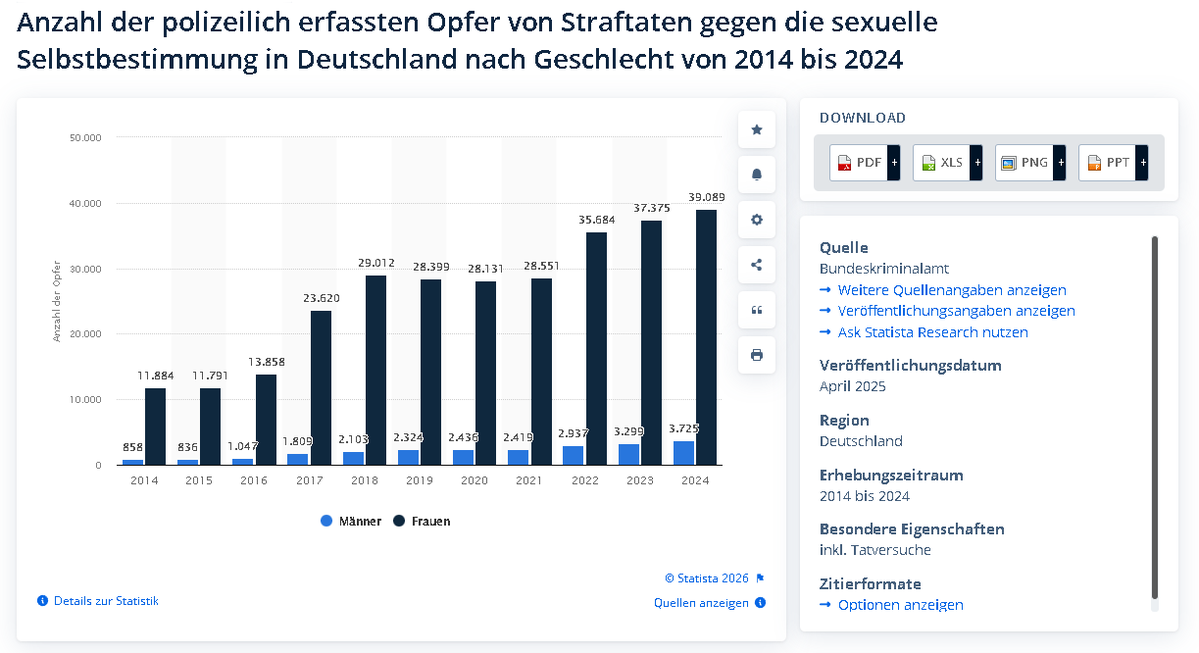 Das wäre 29.200 Kinder jährlich, wenn das Dunkelfeld mit 2 angenommen wird und nicht wie geschätzt mit Faktor 5. Bei den Frauen ist es noch schlimmer, 3 von 100 zeigen ihren Peiniger an. Das heißt das Dunkelfeld ist 33 mal größer als die PKS. Das waren 2024 39.089 Fälle.