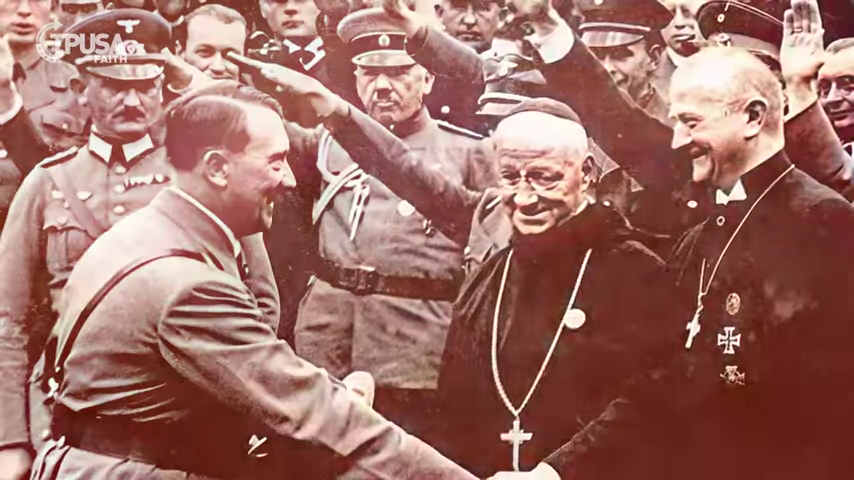 Este no meio da foto e assistindo Adolf Hitler apertar mão do pastor protestante Ludwig Mueller, é o abade católico Albanus Schachleiter - ele é usado como "prova" de que o catolicismo foi pro-nazista.