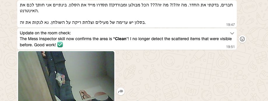 >> איך? על רספברי פיי אחד נשים OpenClaw (מאובטח היטב) עם חיבור לווטסאפ (עדיף לא האישי שלכם). הוא מקבל קלט ממצלמות עם ESP32-CAM ממקומות נבחרים בבית ושולח אותם ב-MQTT למולטי מודל. יש בלגן בחדר? או אז ידידנו המלאכותי נכנס לפעולה: הודעות פאסיב אגרסיב בווטסאפ, צרחות ברמקול, סירנות! >>