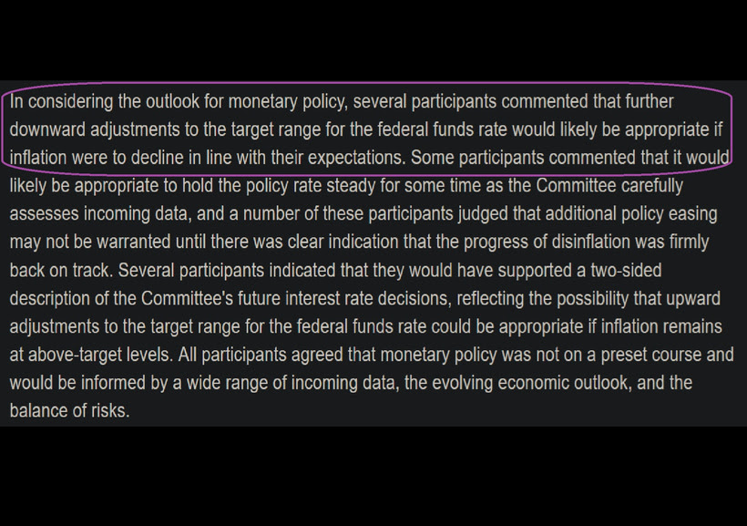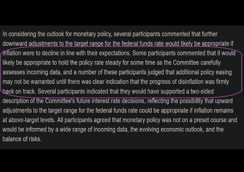 „Niektórzy uczestnicy stwierdzili, że prawdopodobnie właściwe będzie utrzymanie stopy referencyjnej na niezmienionym poziomie przez jakiś czas, ponieważ Komitet starannie ocenia napływające dane, a wielu z tych uczestników uznało, że dalsze łagodzenie polityki pieniężnej może nie być uzasadnione, dopóki nie pojawią się wyraźne sygnały, że postęp dezinflacji zdecydowanie powrócił na właściwe tory”.