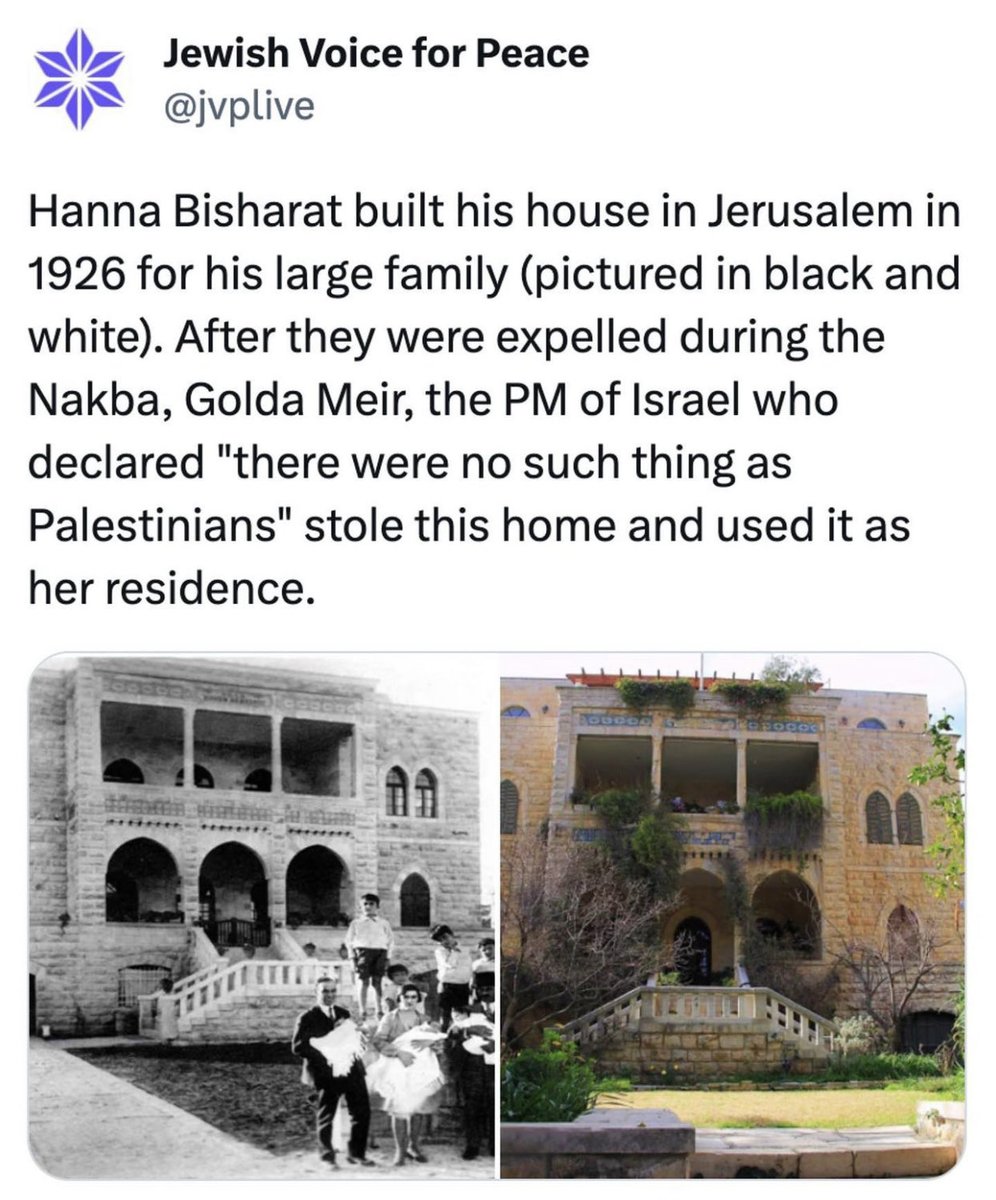 4ª Primer Ministro de "israel", Golda Mavobitch se instaló en la casa que robó a la familia palestina Bisharat en Jerusalen tras la Nakba. Impulsó la colonización ilegal de Cisjordania envenenando pueblos palestinos. Supervisó Crímenes de Guerra en Egipto durante la guerra del 73