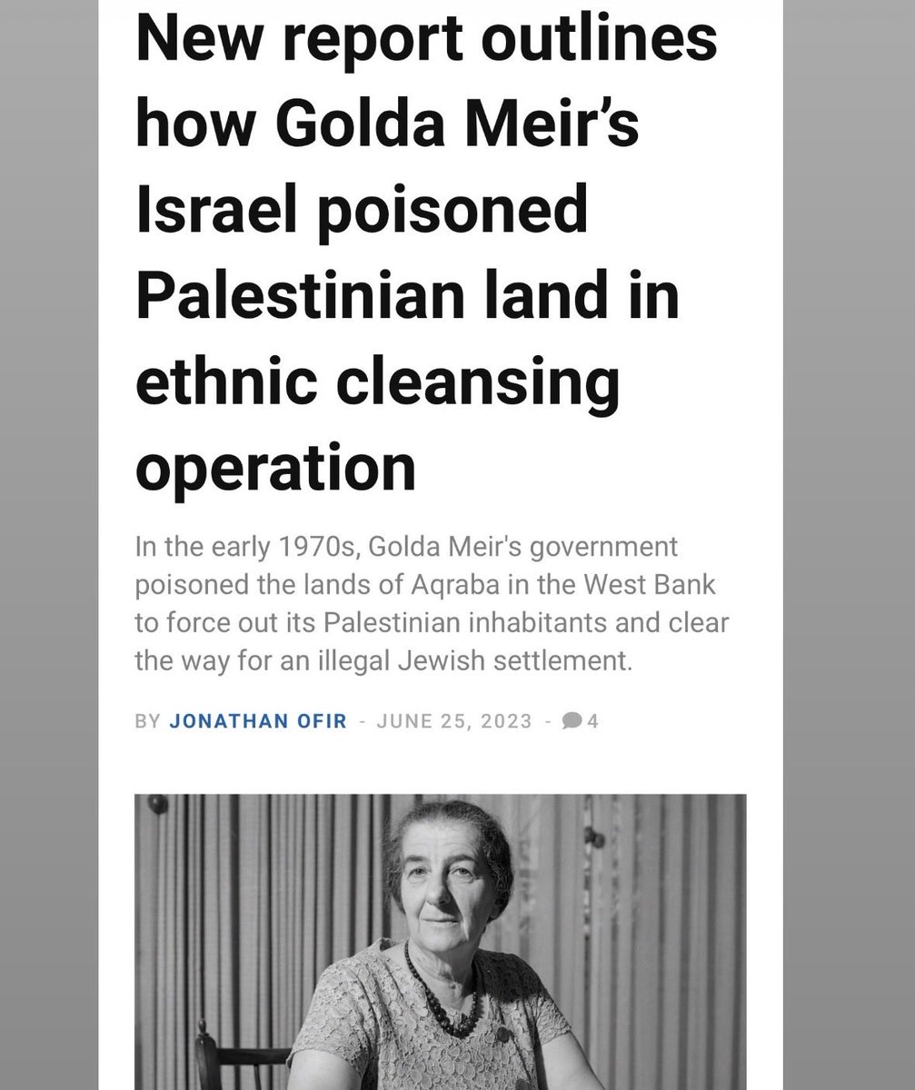 🧵Algunos de los primeros sionistas y fundadores de “israel”: 1- Golda Mabovitch "Meir", ucraniana nacida en Kiev🇺🇦. Pone pie en Palestina hasta sus 23 años. Pese a ello decía que los palestinos "no existen". Criminal de Guerra, envenenó y limpió étnicamente el pueblo de Aqraba⬇️