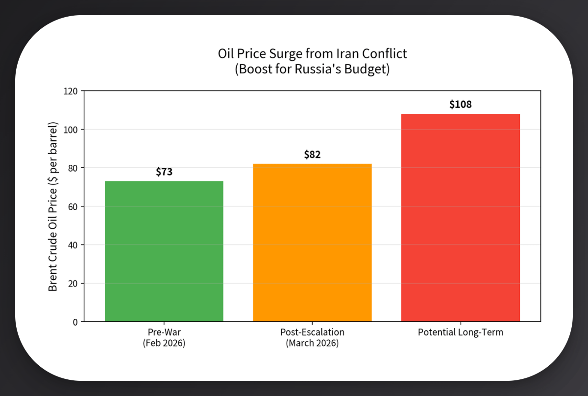 Higher energy, tighter flow: Iran threatens the Strait of Hormuz, missiles fly, and the price of oil goes haywire. Brent crude jumped from $73 to over $90 per barrel with analysts saying it could hit $110+. Putin? He's banking the difference. Russia's Urals crude is suddenly worth way more than Moscow budgeted for 2026. Oil and gas account for ~30% of Kremlin revenue. Do the math. 💸