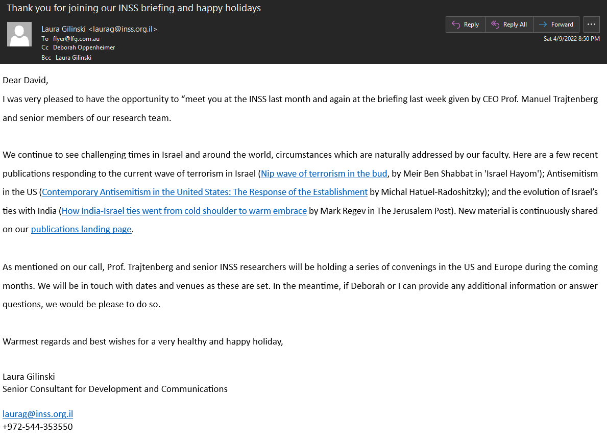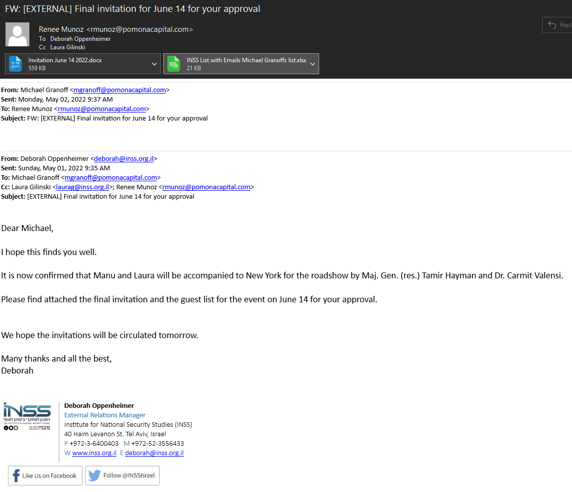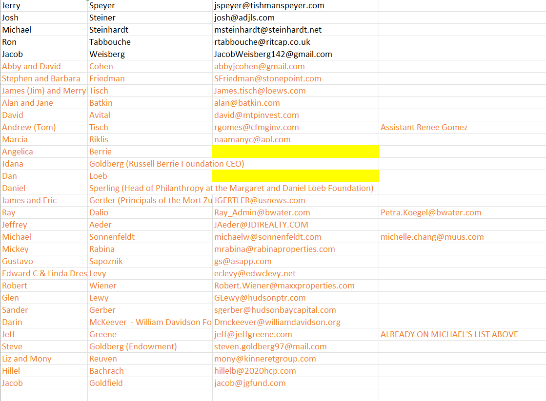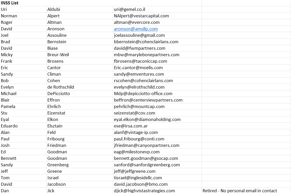 This next email doesn't seem all that important, until you see the attachments--tons of INSS contacts listed--including Evelyn de Rothschild, who died a few months after this was sent: