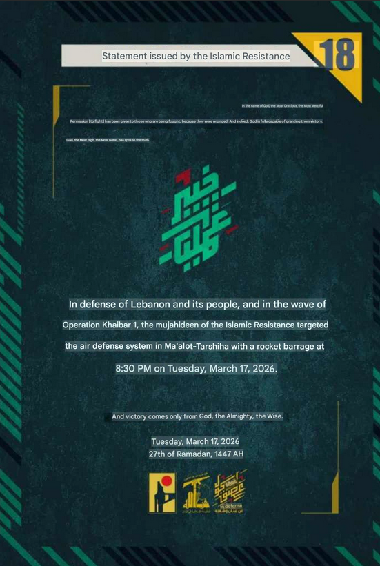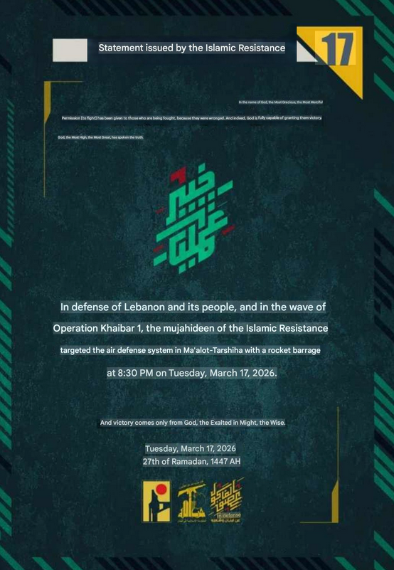 Hezbollah targeted an air defense system in Ma'alot-Tarshiha with a rocket barrage at 08:30 PM (20:30) on Tuesday, March 17, 2026. Confirming that the resistance hit the location for the 2nd time in the same window. The 2nd consecutive strike on Ma'alot-Tarshiha underscores the strategic priority Hezbollah has placed on dismantling the IOF's interception capabilities through redundant saturation.