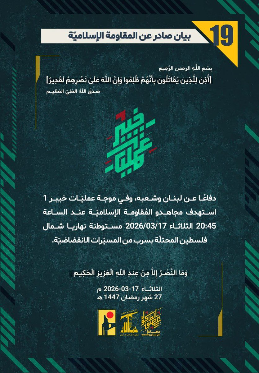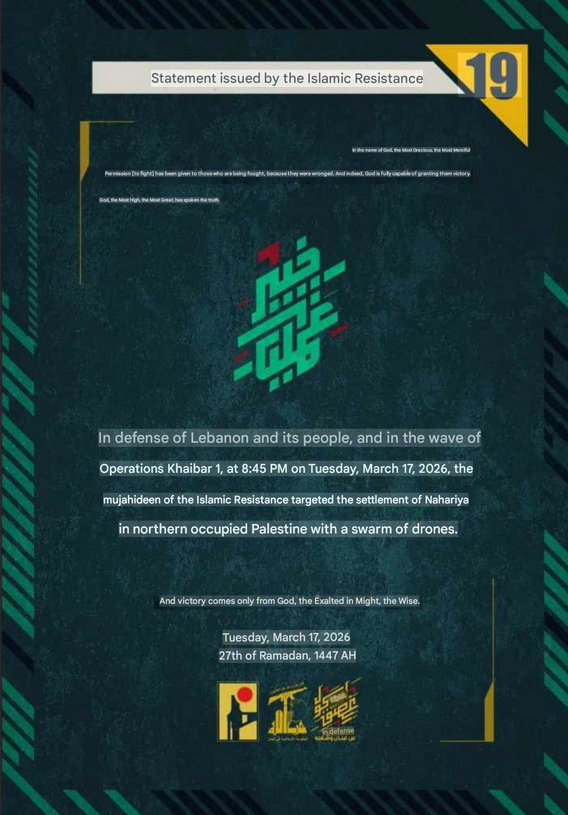 Hezbollah targeted the settlement of Nahariya in northern occupied Palestine with a swarm of drones at 08:45 PM (20:45) on Tuesday, March 17, 2026. The drone swarm occurred just 15 minutes after the double-tap rocket strikes on the air defense systems in Ma'alot-Tarshiha (17 & 18). Nahariya has now been targeted twice today (first at 08:30 AM, 10). This 2nd, more complex attack at 20:45 ensures that the Western Galilee remains in a state of total operational paralysis.