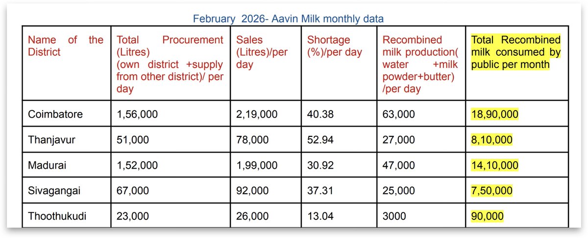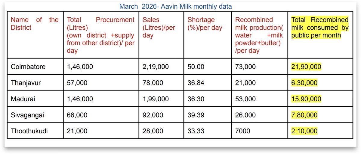 சரி பிப்ரவரி மாதம் மட்டும் தானா என்றால் அதற்கு அடுத்த மார்ச் மாதம் 2026-க்கான புள்ளி விவரம் இது.. இதில் அதை விட மோசம் எடுத்துக்காட்டிற்கு கோவையை மீண்டும் எடுத்துக் கொள்வோம்.. 1,46,000 லிட்டர் பால் ஒரு நாளைக்கு கொள்முதல் செய்கிறார்கள். அதாவது சென்ற பிப்ரவரி மாதம் விட 10,000 லிட்டர் குறைவாக. ஆனால் விற்பனை 2,19,000 லிட்டர் ஒரு நாளைக்கு விற்பனை செய்கிறது ஆவின். ஆக கூடுதலாக 73,000 லிட்டர் பால் ஒரு நாளைக்கு எங்கே இருந்து வந்தது? அதுவும் மேலே சொன்னது போல் தான் அனைத்து பிற மாவட்டத்தின் நிலையும் இப்படி தான்.. மதுரை , தஞ்சாவூர் , சிவகங்கை , தூத்துக்குடி புள்ளி விவரங்கள் இங்கே... ஒரு வேளை வெளியில் காலம் தொடங்குவதாலா? அப்போதும் அதிக பால் எங்கே இருந்து வந்தது? Recombined Milk தான்.. அதை பார்ப்பதற்கு முன்