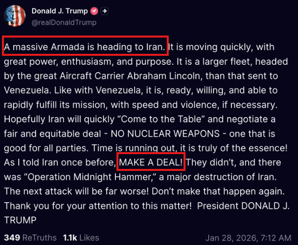 « une immense armada se dirige vers l’Iran », menaces répétées, ultimatum pour « faire un deal ».