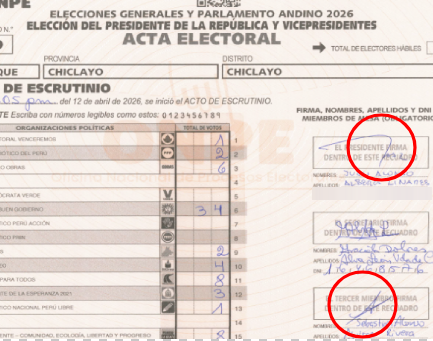 Sin embargo, en la mesa 032569 de Chiclayo donde ganó también se presenta trazos de las firmas de los miembros de mesa fuera de los recuadros, pero aquí los personeros de Renovación Popular no pidieron nulidad.