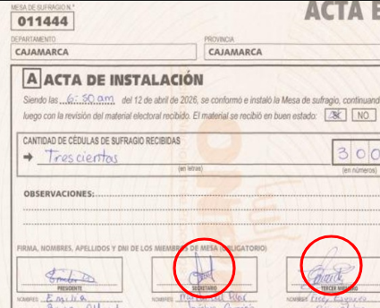 Primer caso. RLA pretende anular la mesa 011444 de Cajamarca solo porque un trazo de las firmas de los miembros de mesa están fuera del recuadro.
