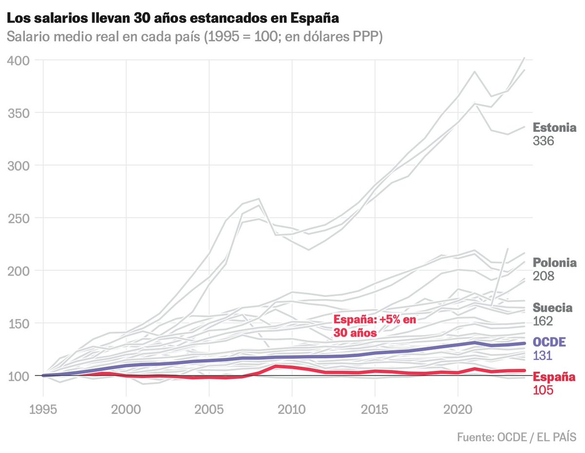 En realidad llevan 30 años estancados. El sueldo medio real solo sube 5% desde 1995, frente al 31% de la OCDE.