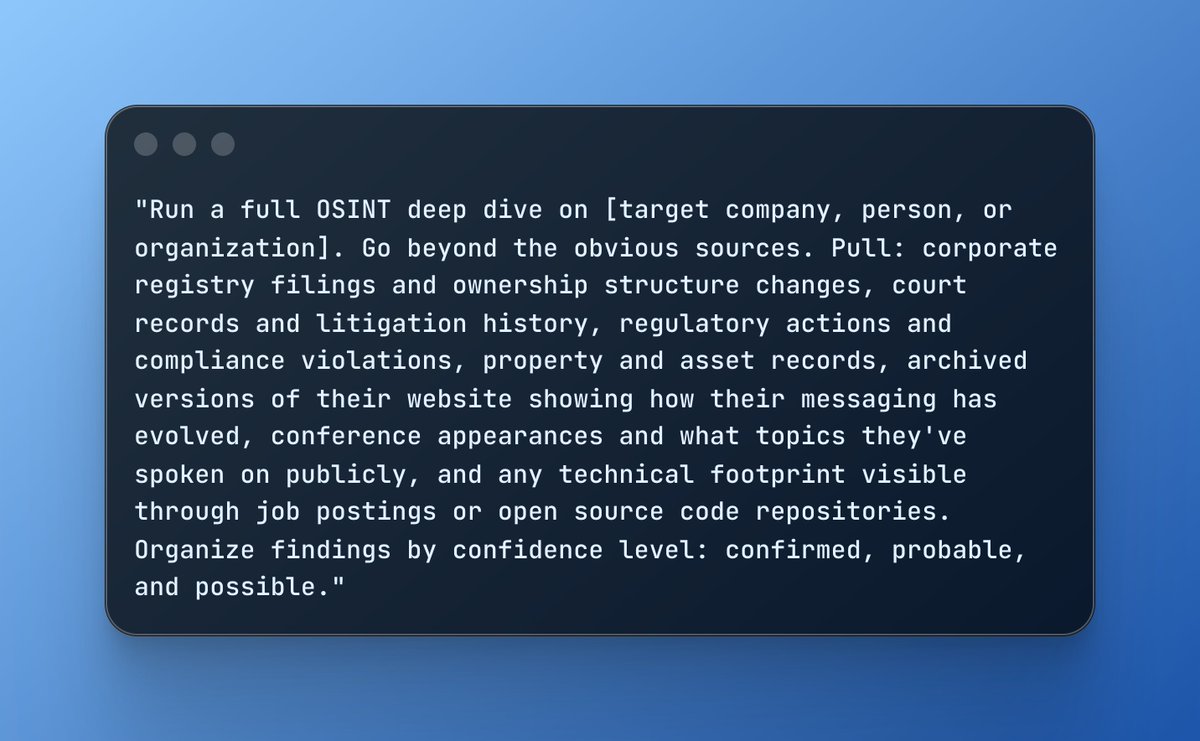 "Run a full OSINT deep dive on [target company, person, or organization]. Go beyond the obvious sources. Pull: corporate registry filings and ownership structure changes, court records and litigation history, regulatory actions and compliance violations, property and asset records, archived versions of their website showing how their messaging has evolved, conference appearances and what topics they've spoken on publicly, and any technical footprint visible through job postings or open source code repositories. Organize findings by confidence level: confirmed, probable, and possible."