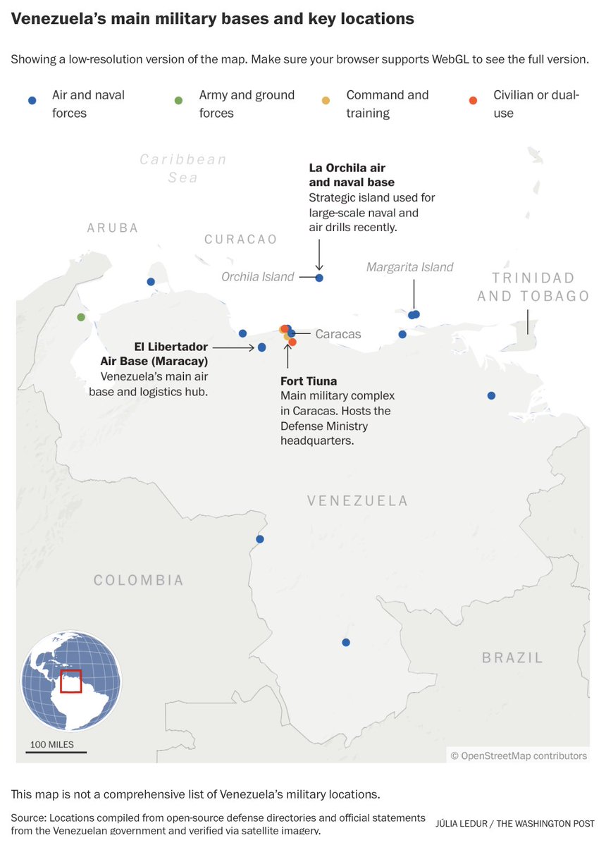 WaPo: “Look for precision kinetic strikes against narcotics targets and military capability and, if that doesn’t have the desired effect, against leadership,” Jim Stavridis, a retired U.S. admiral, said. “I think the game here is to convince Maduro that his days are numbered, but convincing him of that will take a fair amount of strikes against Venezuela’s infrastructure.”