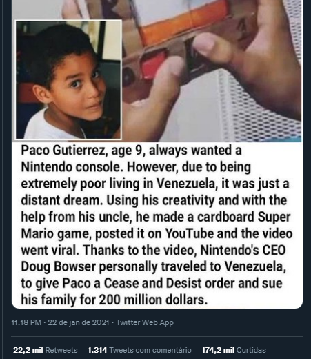 20 de janeiro lansamo essa piadoca ai pra geral mete uns "kkkk" e uns "tipico da nintendo mesmo" "n duvidaria se fosse verdade", todos rimos, ninguem foi processado (+)