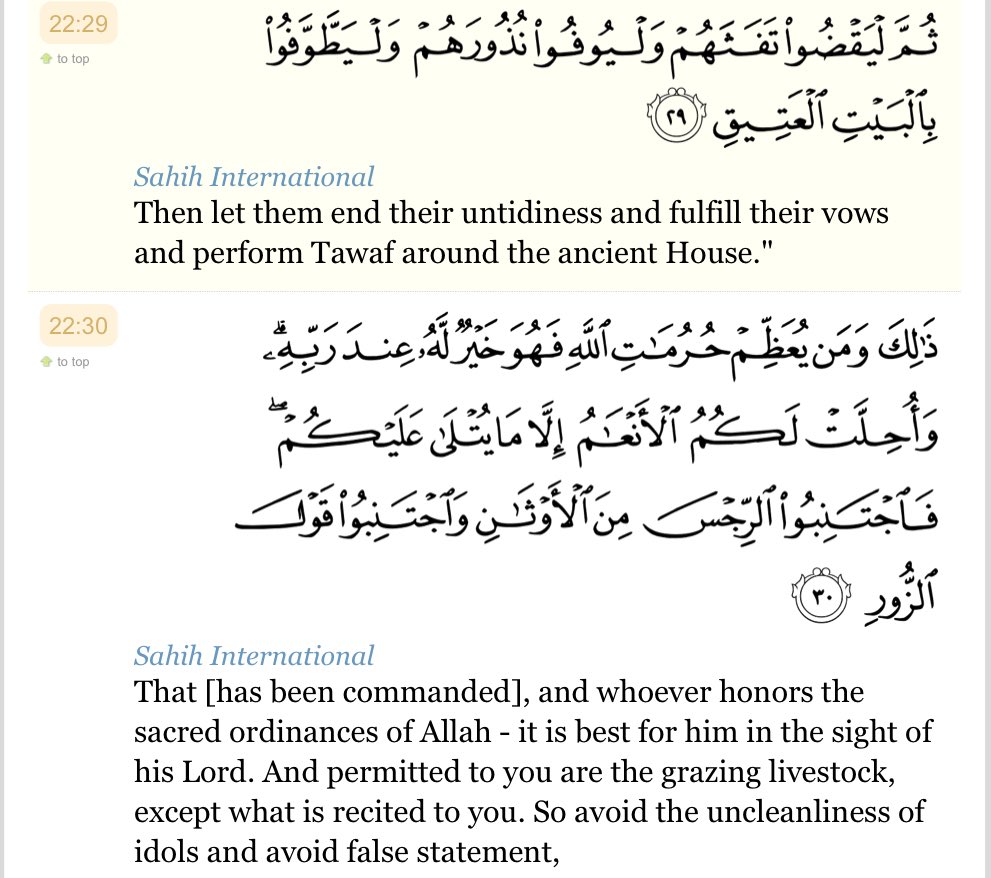 The Quran instructs its followers, when performing the rites of pilgrimage (Hajj), including circumambulating the Kaaba & sacrificing livestock, to avoid idols & to refrain from false speech. However, some may argue about it, so additional evidence will help clarify the picture…
