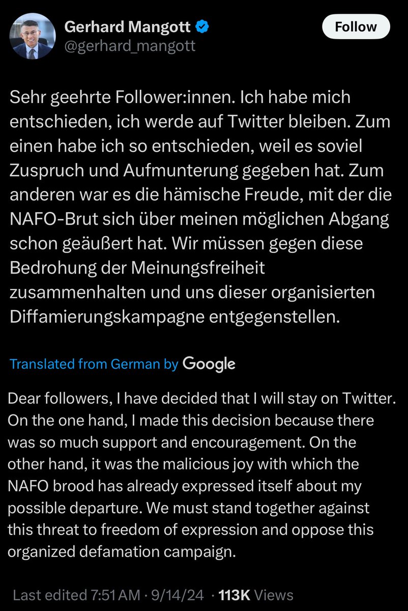 While bemoaning NAFO’s dirty methods Gerhard was reduced to calling us idiots, clowns, fools and a brood 🤷♂️.