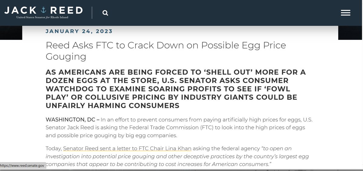 Since you were on the Commission for much of the Biden-Harris Administration, I assumed you knew that eggs and poultry are traditionally within DOJ’s enforcement domain, not the FTC’s. I also assumed that’s why, for years, you did absolutely nothing about rising egg prices. The price of eggs surged under Biden. The whole country suffered. But you launched no investigations. No lawsuits. No studies. Nothing about eggs. Now, we get posts.