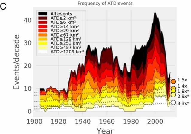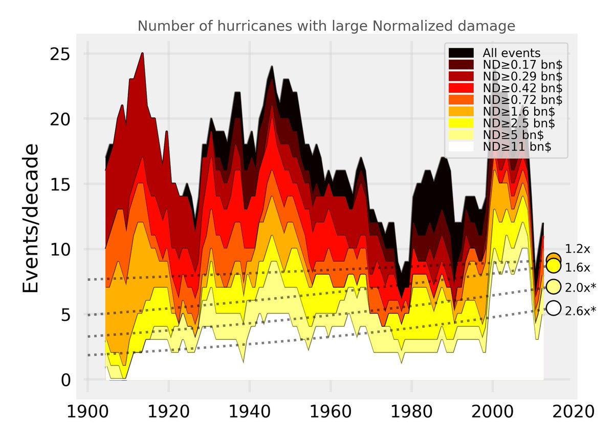 The largest hurricane surges have also become 3x more frequent per century.
