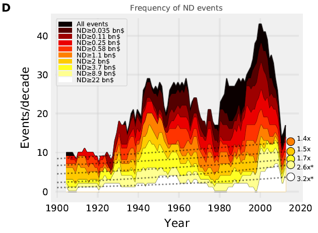They argue that some small events are missing in the early part of the record, -they guestimate their ND value. Unfortunately we can see that this has a profound effect on the distribution which looks sick (pre-1940, ND<1bn).