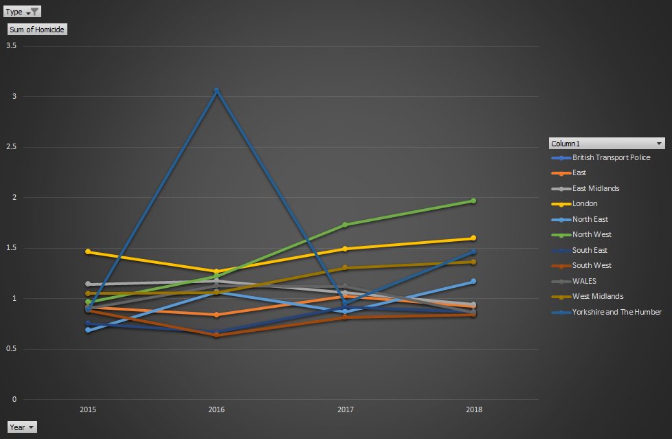 Total Crime Recorded has increased across all regions of the UK since 2015. This could be due to more people reporting though. London while having the most overall crime does not have the highest rate and has seen little increase x