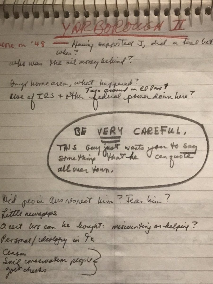 “BE VERY CAREFUL.” Check this all-caps warning Caro writes to himself about how to portray a source. (Can’t conclude from this page alone, but there is a Texas Sen. Ralph Yarborough who appears in the Passage of Power, Caro’s fourth volume in the LBJ biography.)