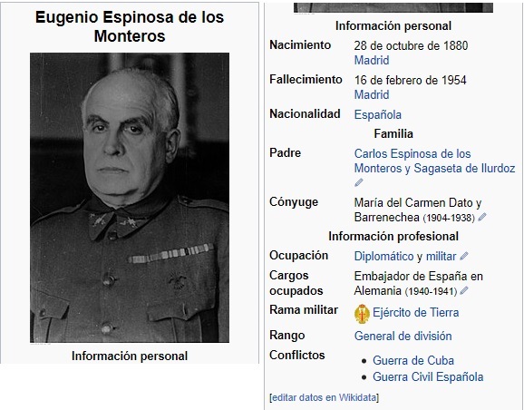 En los años 1941 y 1942, el embajador franquista en la Alemania nazi se llamaba Eugenio Espinosa de los Monteros. En la foto del encuentro entre Hitler y Franco le vemos muy atento y muy cerca.