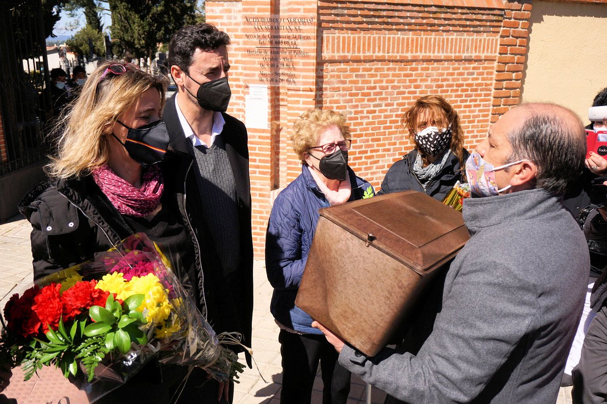 Carlos, minero prejubilado y voluntario de la Asociación para la Recuperación de la Memoria Histórica, la persona que encontró en la fosa de El Espinar la alianza matrimonial de Eugenio Insúa, entregó a la familia una urna con sus restos.