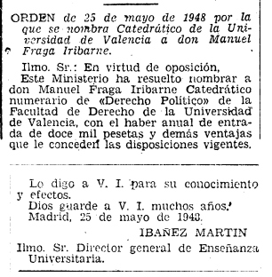 Manuel Fraga Iribarne nació en 1926 y con sólo 26 años accedió a una plaza de catedrático Univerasitario. Y todo gracias a una universidad en reconstrucción, arrasada por la represión y llena de vacantes por la represión política. Claro y por su falta de escrúpulos...