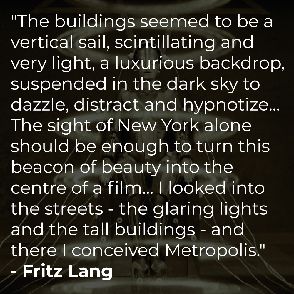 In 1924, Austrian filmmaker Fritz Lang visited New York City for the premiere of his film Die Nibelungen and, struck by the Art Deco architecture, began developing ideas of a tale set in a futuristic city. He pitched it to German production company UFA, and they loved it.