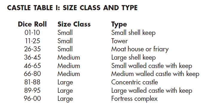 Let's have a gander at the first chart, and determine the size of your castle. Is it a mere lonely watchtower? Or a vast, sprawling place that might rival a small town (a Keep...on a borderlands, perhaps?)