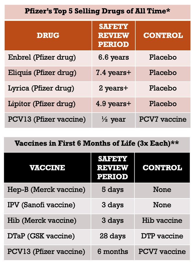 The following chart compares the pivotal trials for Pfizer and Moderna’s Covid-19 vaccines with those for FDA licensed vaccines that CDC recommends be injected (three times each) between birth and six months of age: