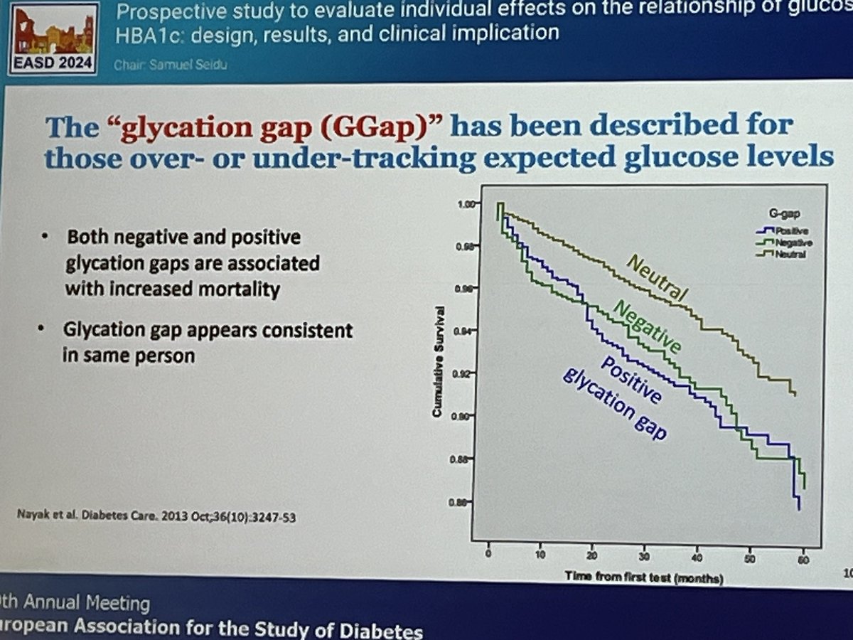 Wide variation in HbA1c with average glucose levels. The resulting positive and negative glycation gap is associated with increased mortality. This gap is related to red cell characteristics and ethnicity #EASD2024 #diabetes ⬇️