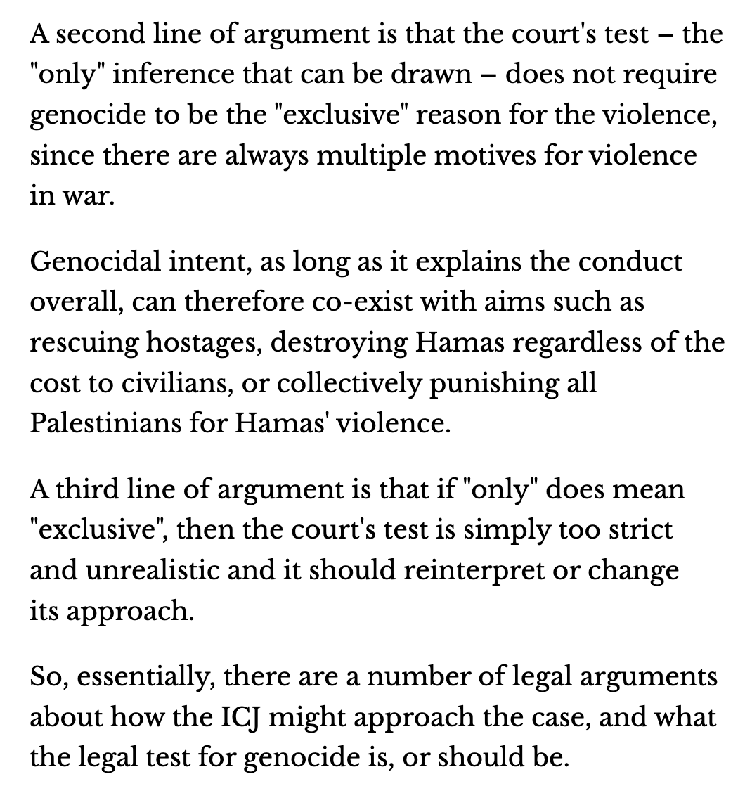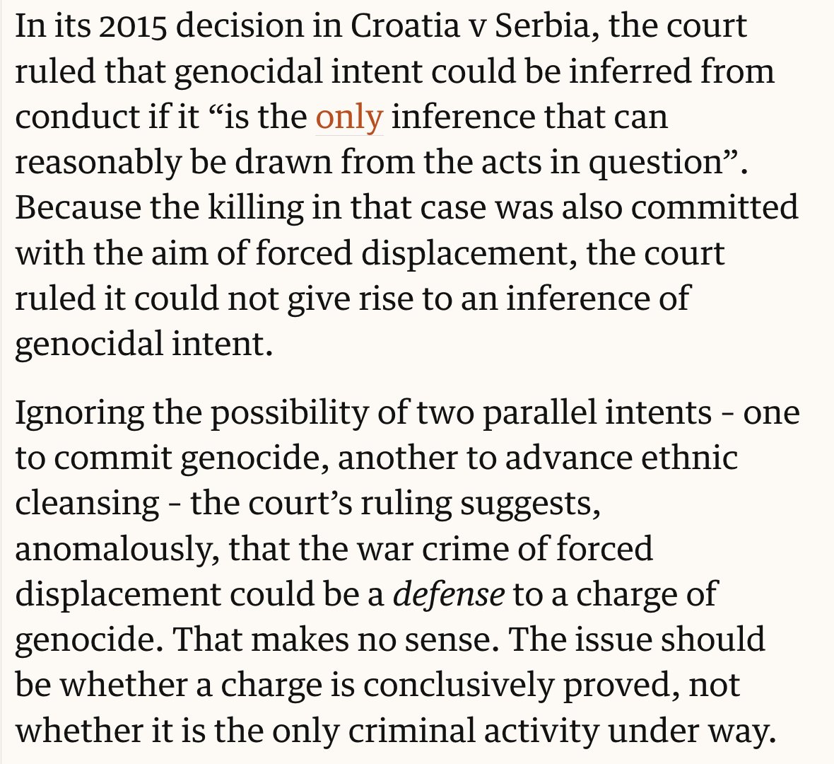 https://twitter.com/DovWaxman/status/19538816373908111762. The ICJ's "only reasonable inference test" does not imply that genocidal intent must be the perpetrator's exclusive intent.