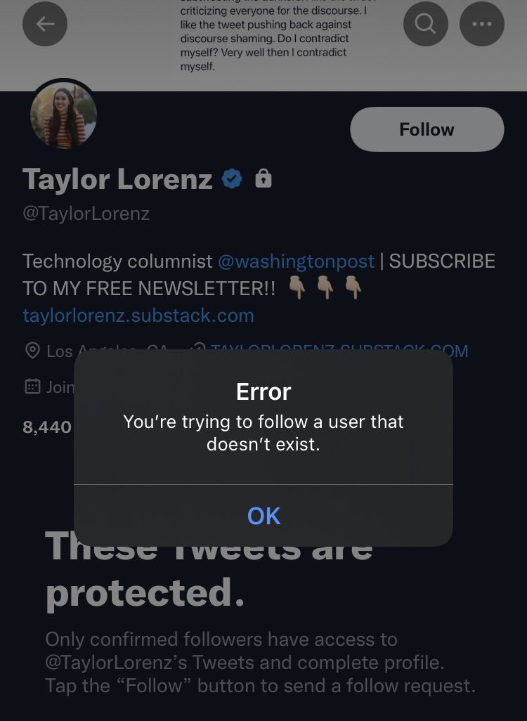 Saw her page when I checked myself. Clicked follow to see what happens and got this message. Glorious.