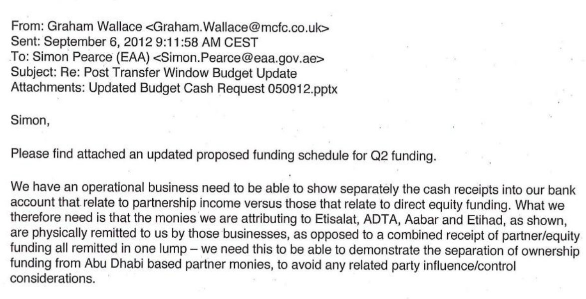 1/ Like this which is rerouting money through multiple companies rather than direct via ADUG (Abu Dhabi United Group): 2/ Here Graham Wallace mentions to Simon Pearce Manchester City will need to demonstrate commercial income from multiple partners (in this case, 4) so rather than be sent a lump sum from Abu Dhabi it needs to be sent from elsewhere to avoid being caught depositing owner equity.