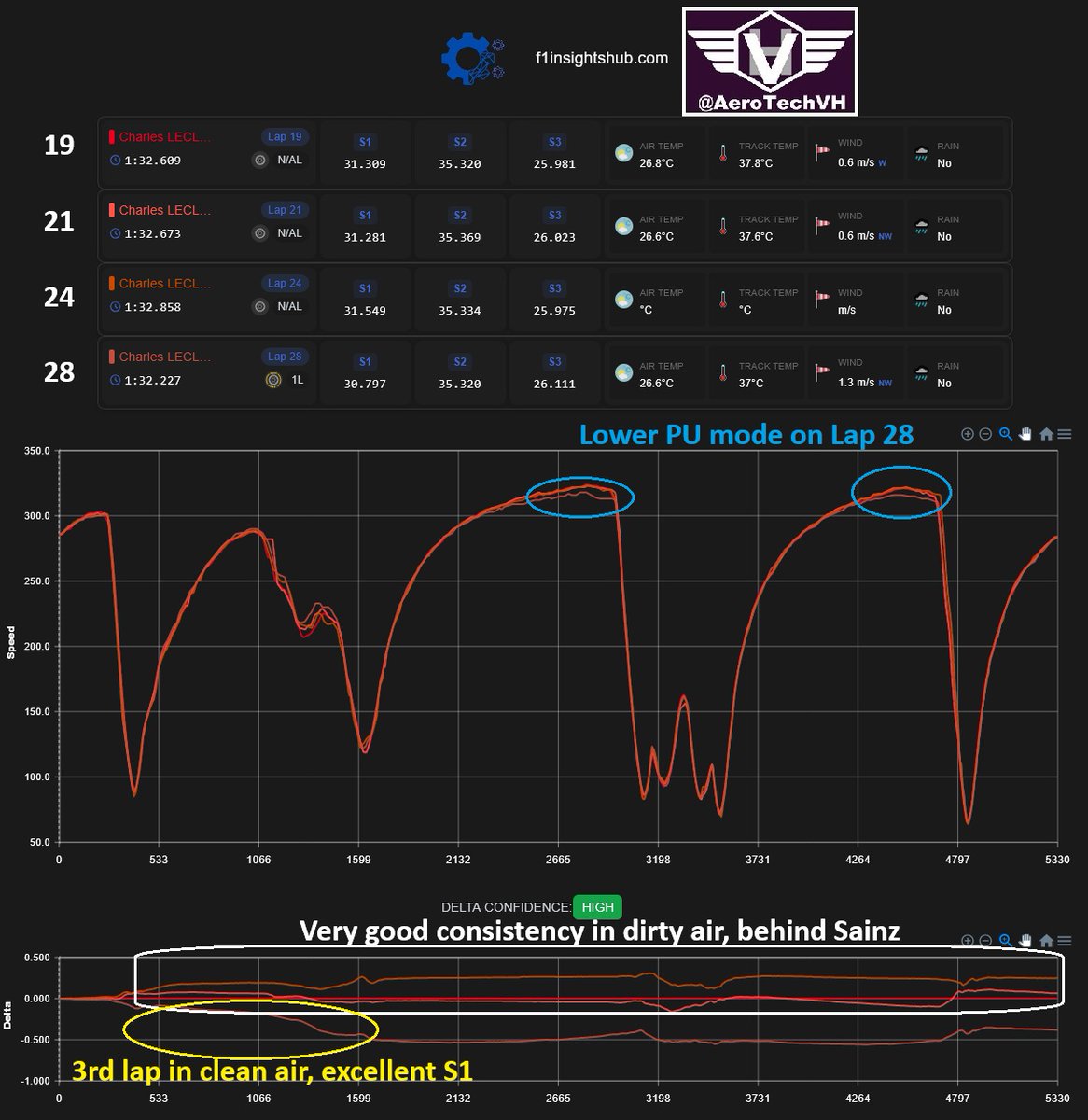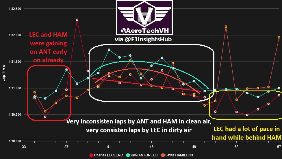 If we compare Hamilton's laps in clean air on Mediums vs Leclerc's laps in dirty air on Mediums (1st Stint behind Sainz) we see significant inconsistency in overpass section, while also having inconsistency in S1 with a big mistake on T2 exit on Lap 47