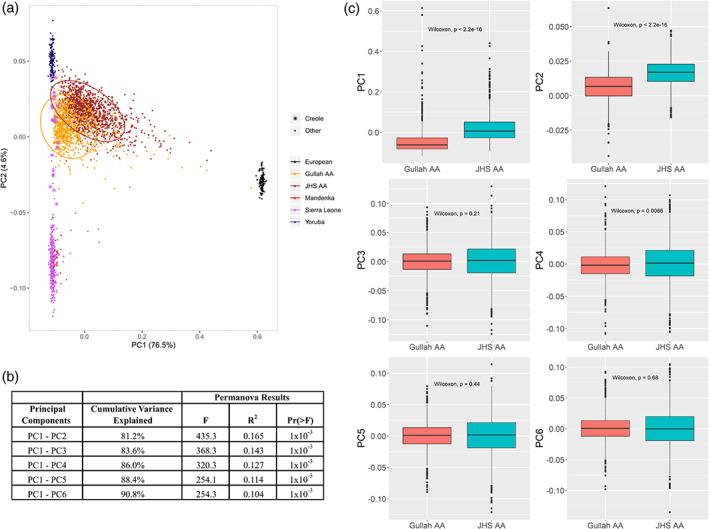 "PCA of Gullah and non‐Gullah African Americans........... African ancestral reference populations (YRI samples from Nigeria, Mandenka from Senegal, and Sierra Leone samples) illustrates the Gullah's closeness to Sierra Leone populations and the Mandenka"