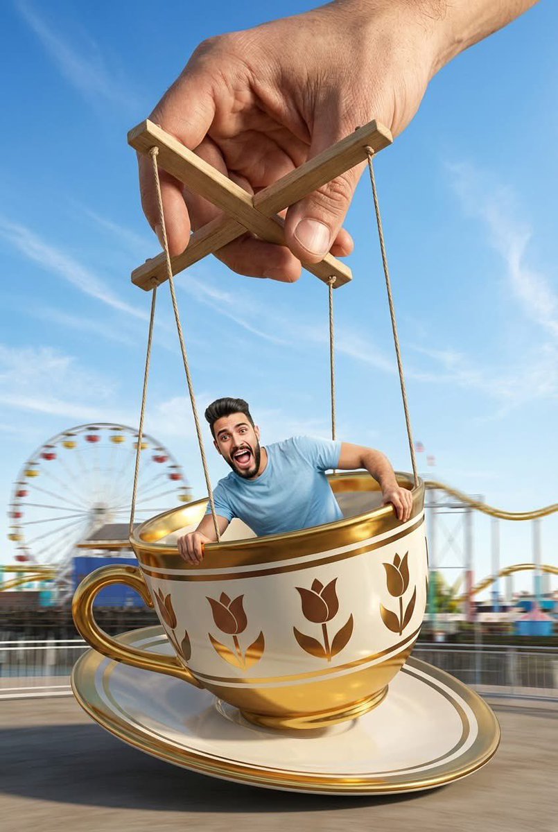 A hyper-realistic, 8k, cinematic wide-shot captures a surreal scene from a slightly low angle, looking up towards a vast horizon. The composition is dominated by a colossal, rugged, light-colored stone cliff face featuring a perfectly circular opening, acting as a natural frame. The interior surface of this massive archway is highly textured with rough, weathered details and striations. Within this opening, at the very bottom edge, a person (uploaded face as reference) is comfortably reclined on a brown leather chaise lounge, reading an open book. The person wears a light-colored long-sleeved shirt, dark trousers, and glasses, engrossed in their reading. The chaise lounge is positioned on a rough, light-colored rocky ledge that extends slightly from the cliff, with several stacks of books scattered nearby on the ground. Beyond the circular opening, an expansive, highly detailed sea of fluffy cumulus clouds stretches to the distant horizon, creating a breathtaking vista. The clouds exhibit volumetric lighting, with bright highlights from a warm, golden hour sun, and soft shadows defining their forms. The sky above transitions from a deep, clear blue at the top to a lighter, hazy blue-grey near the horizon, subtly showing the curve of the Earth. Dramatic, directional sunlight casts long, soft shadows on the cliff face and ground, while providing strong rim lighting on the person and chaise lounge, separating them from the luminous cloudscape. The overall effect is dreamlike and majestic, emphasizing the impossible scale and serene isolation of the scene.