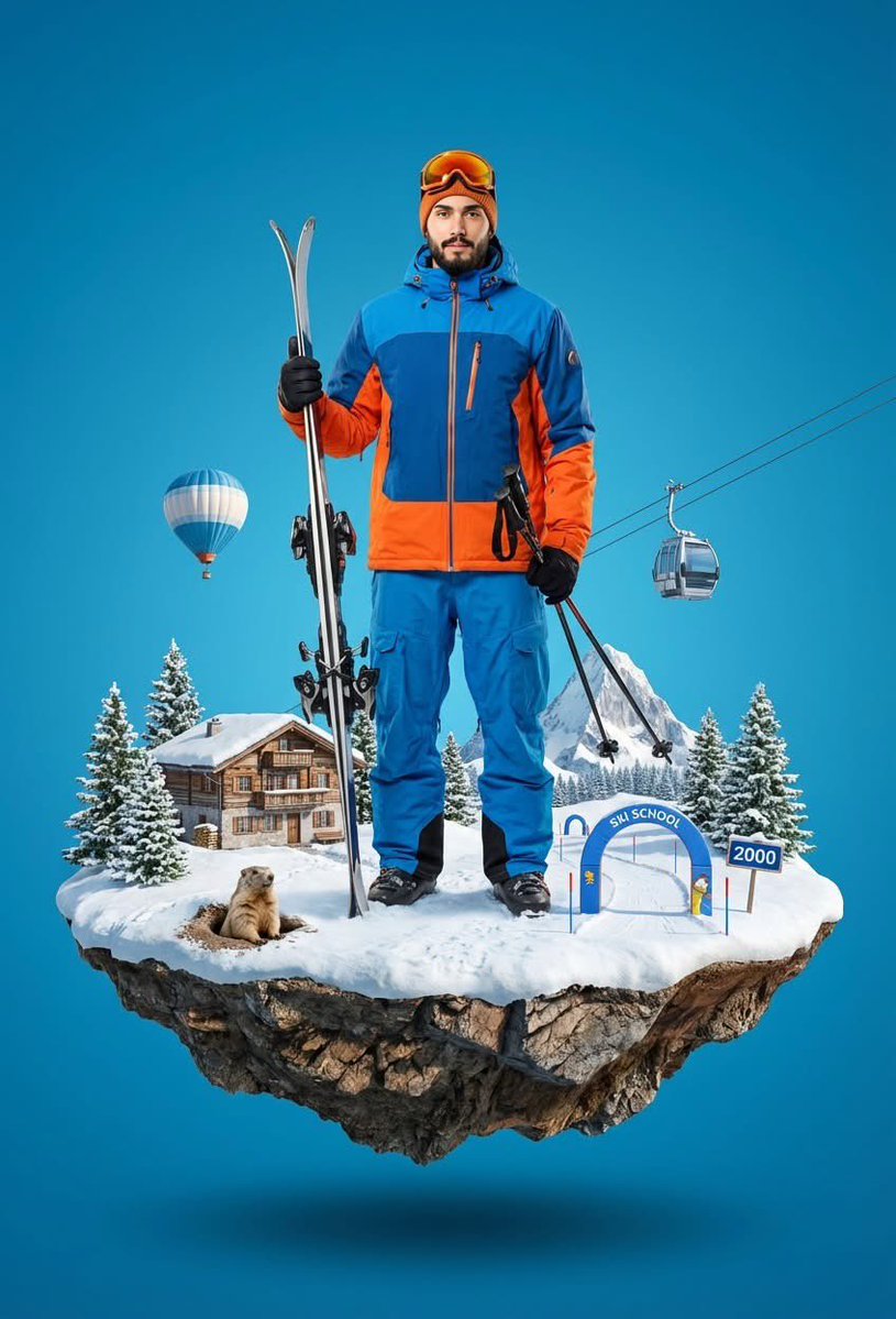 A hyper-realistic, surreal commercial composite featuring a full-body shot of a skier with uploaded face as reference, standing heroically atop a floating, isolated island of snowy terrain suspended in a solid cerulean blue void. The subject is dressed in professional winter gear, wearing a two-tone blue and orange technical ski jacket, baggy blue ski pants, and orange goggles resting on a beanie, holding a pair of skis and poles with gloved hands. The composition utilizes a "microworld" or isometric diorama aesthetic where the skier appears larger than life relative to the miniature environment around them. The floating ground reveals a cross-section of rocky soil and stone at the base, where a small marmot peeks out from a burrow. The snowy surface is populated with miniature details: a rustic wooden alpine chalet, snow-dusted pine trees, a small ski school course with a blue arch, and a blue circular trail sign reading "2000". In the background, a miniature snow-capped mountain peak rises, and a hot air balloon floats in the distance. Overhead, a modern ski gondola hangs from cables that cut diagonally across the upper frame. The lighting is high-key and vibrant, mimicking high-end advertising photography with sharp focus, global illumination, raytraced shadows, and 8k Octane Render quality textures on the nylon fabric and snow particles.
