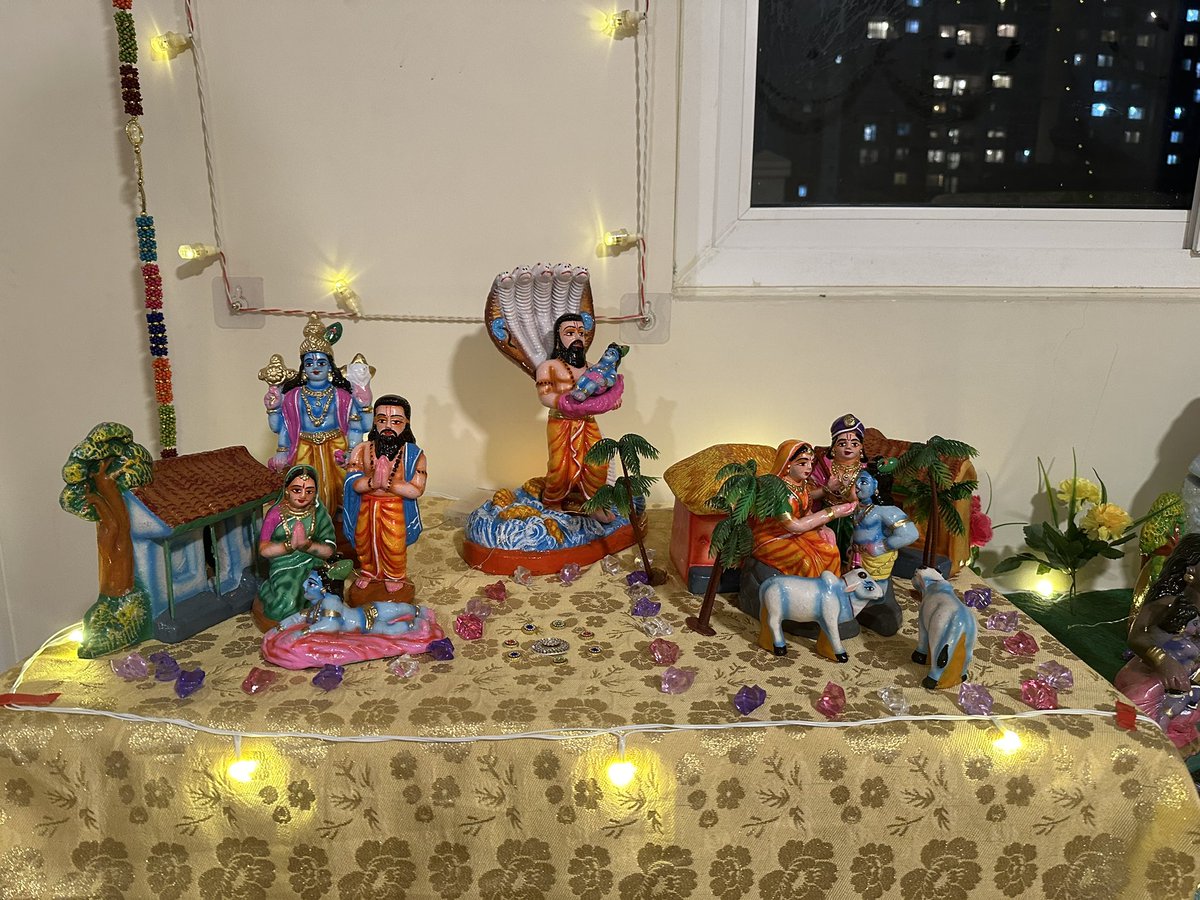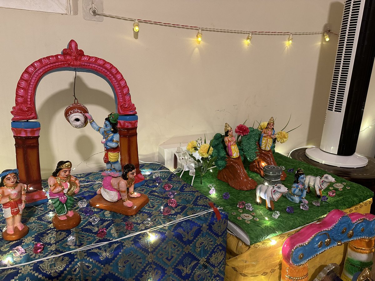 The story of Krishna- from his birth, Vasudeva taking him across Yamuna, and his childhood there; vanquishing the demons Puthana, Trinavarta, Bakasura, Dhenukasura; stealing butter, releasing Kubera’s sons trapped in the trees; lifting Govardhan mountain, dancing on Kalia (2/n)