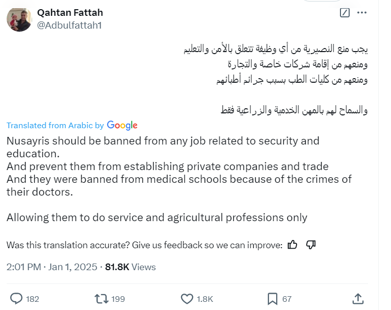 "Alawites must be banned from all jobs in Syria except agriculture & service oriented jobs" says the ordinary arrogant anti-Assad Syrian species .