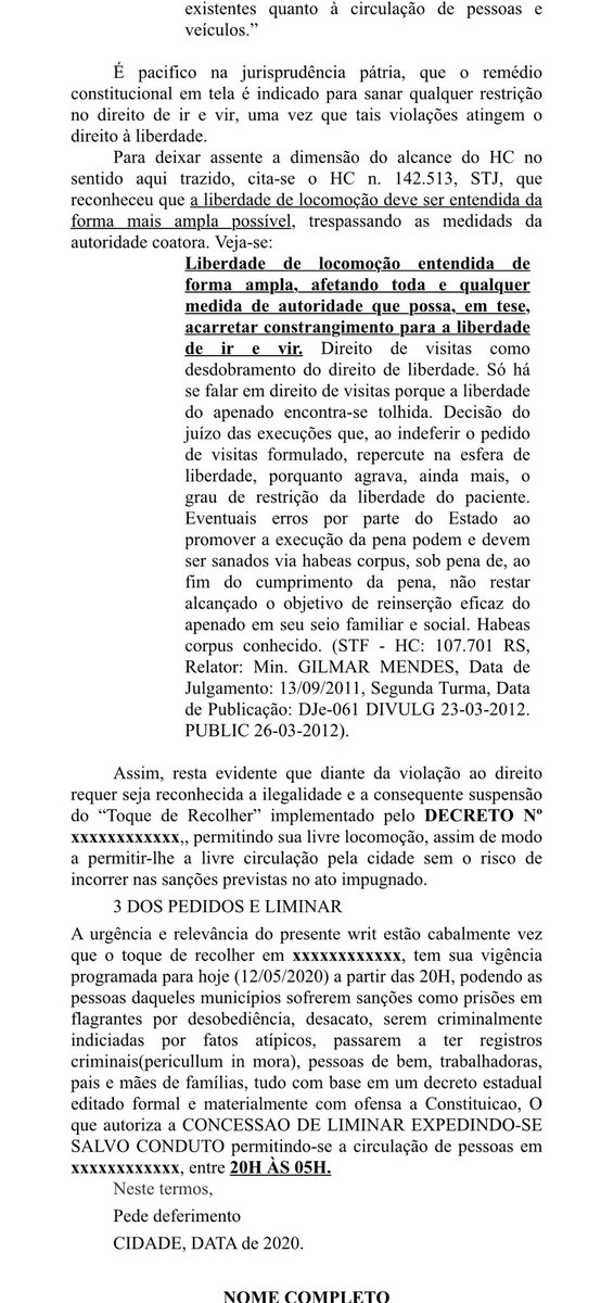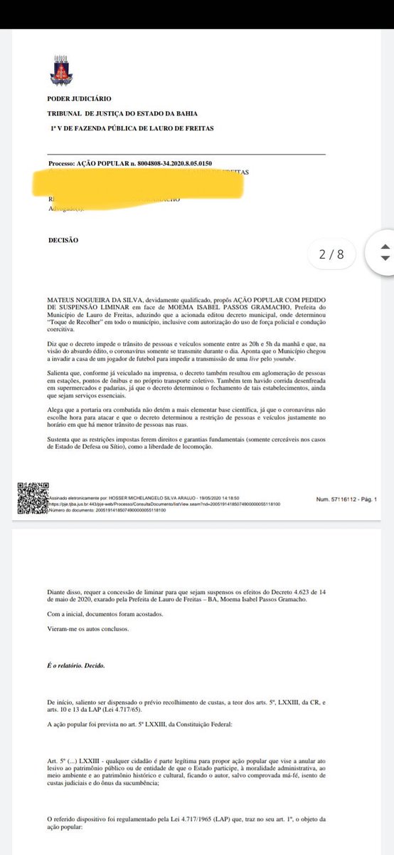 A mobilização judicial deu o primeiro fruto. Um cidadão de Lauro de Freitas (BA), cidade q a prefeita do PT decretou toque de recolher, ajuizou um #HabeascorpusBrasil e uma Ação popular c pedido liminar. Juiz concedeu liminar da AP suspendendo o decreto totalitário. HC foi p o TJ