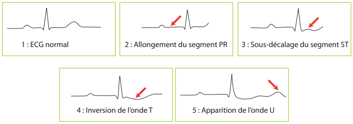 (grossièrement, l’hyperK a tendance à ralentir, l’hypoK a tendance à accélérer)