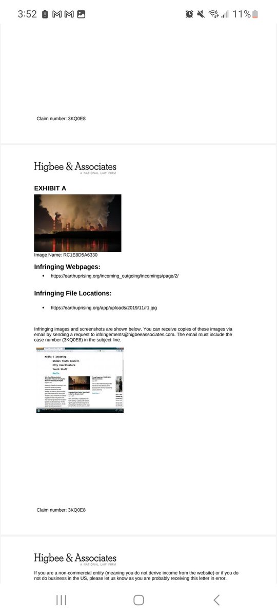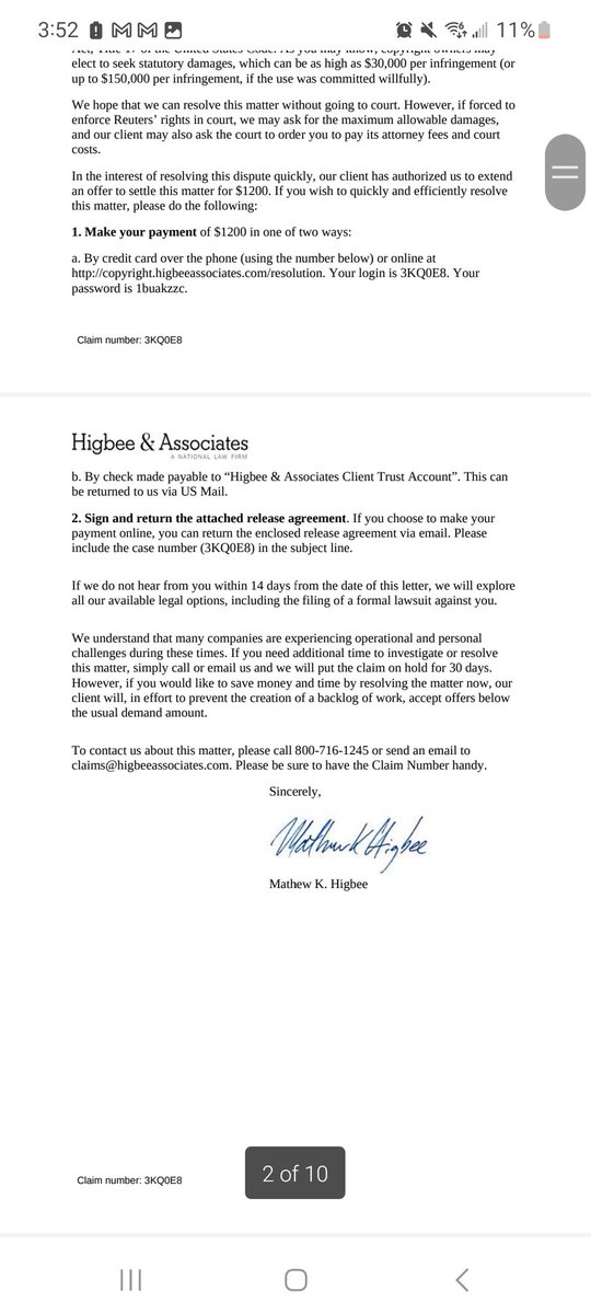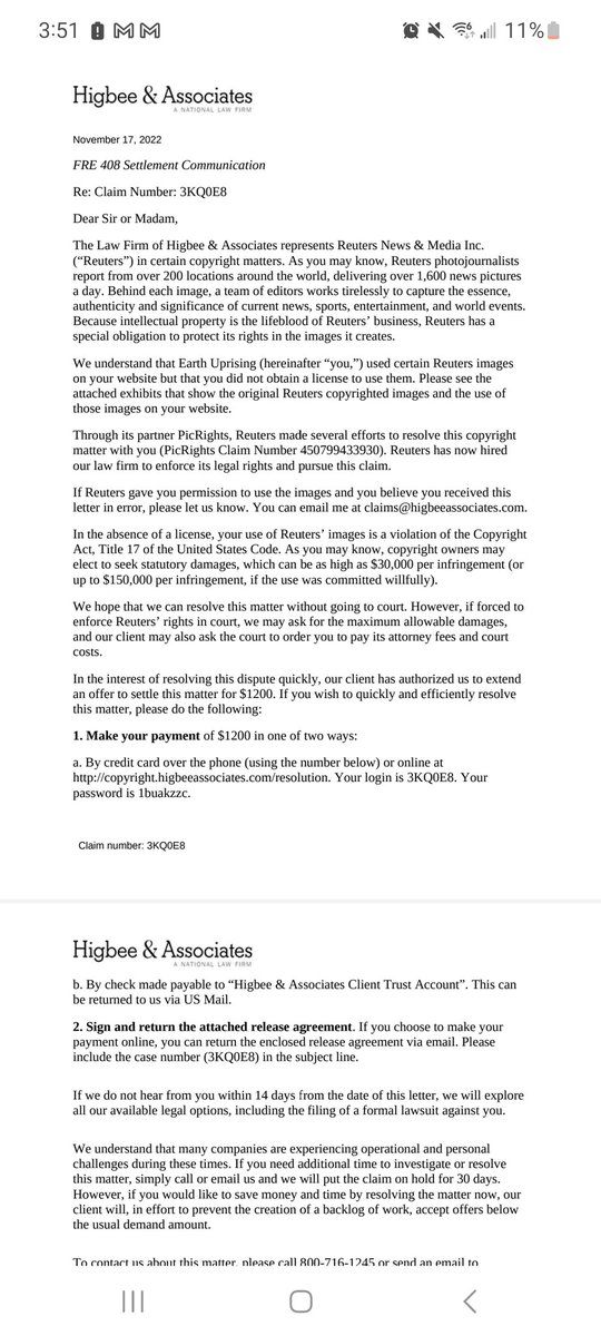 Previously, we had reposted a news article on our website, and in doing so, WordPress brought over the image associated with the news article. They're claiming this violated their copyright, and now Higbee and Associates is demanding money from us /2