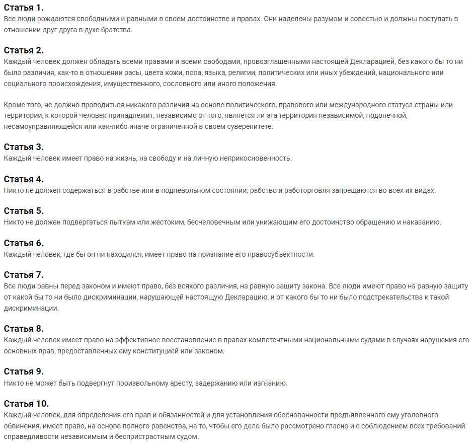Первая известная публикация Декларации в СССР на русском языке в служебном издании «Курьер ЮНЕСКО» № 10 за 1958 год, а также в брошюре Анатолия Мовчана «Международная защита прав человека», выпущенной в том же году для служебного пользования. ⬇️