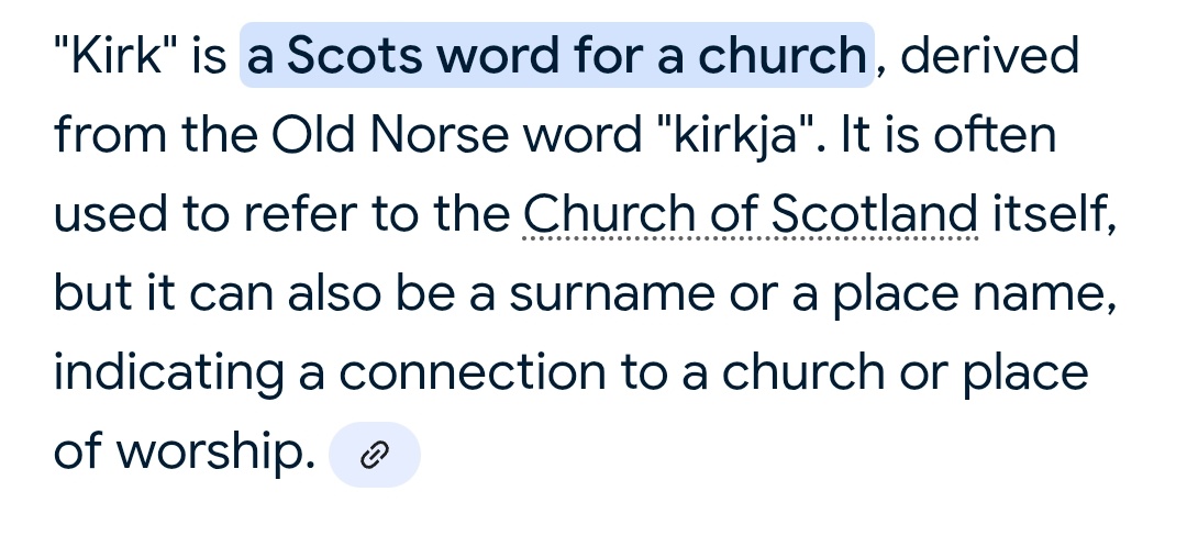 Kirk comes from the Old Norse kirkja (church), which itself derives from the Greek kyriakon (“the Lord’s house”).
