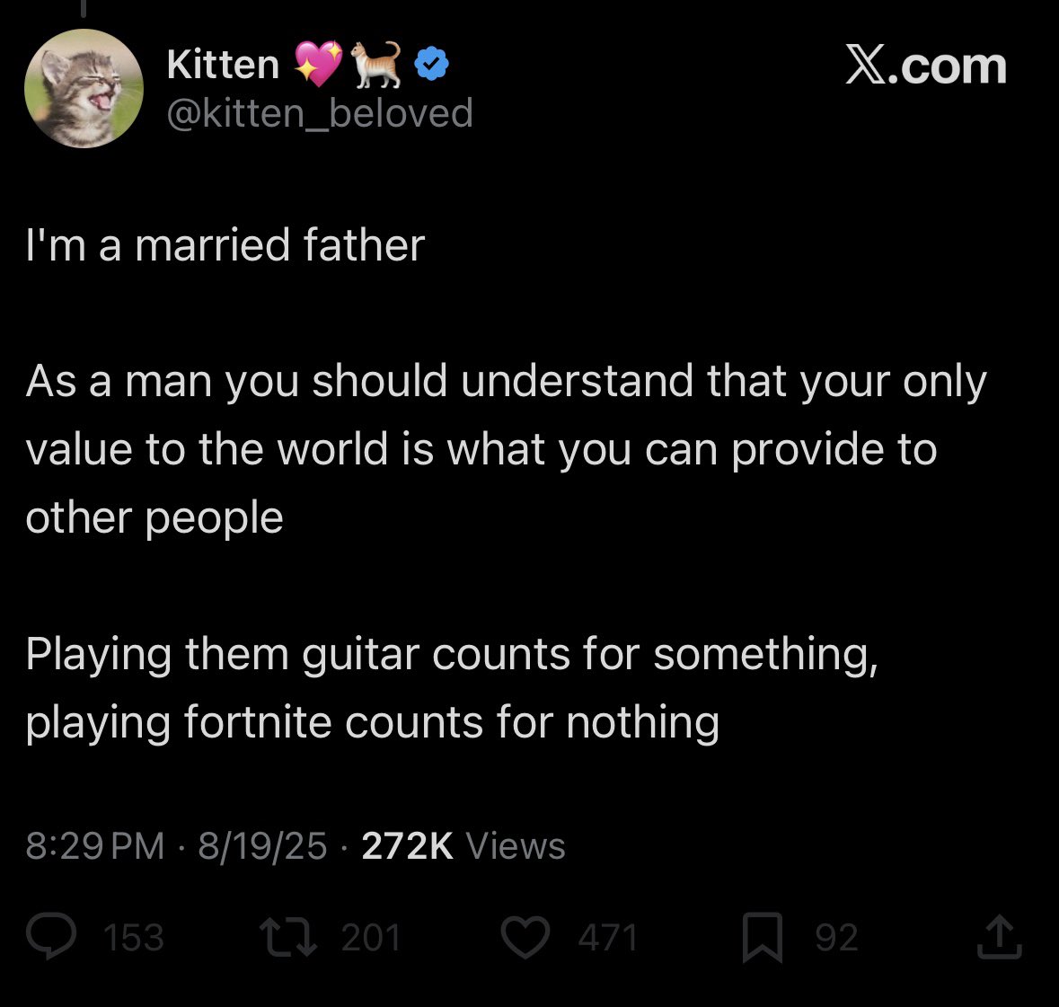 https://twitter.com/zacharyofulster/status/1960056896808706054These are the same kind of people that deride all anime consumption as “pоrn addiction,” for example – almost always because they are struggling with their own habits, or know that they possess only the frailest hold on some kind of temperance. Defective people lashing out.